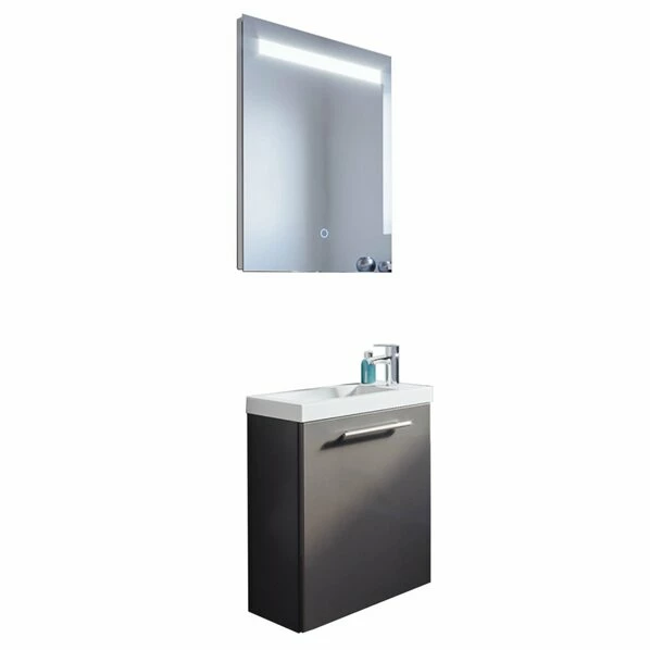 Dieses Badmöbel-Set ist die perfekte Lösung für kleinere Bäder. Durch die anthrazitfarbene Front bietet das Set einen exklusiven Blickfang für Ihr Bad. Die Tür des Unterschrankes ist beidseitig anschlagbar. Zudem erfolgt die Montage des Spiegels durch einfaches Aufhängen an der Wand. Der LED Spiegel sorgt mit der Touch-Funktion für eine optische Vergrößerung, hierbei genügt eine kurze Berührung um die LED Beleuchtung an oder auszuschalten. Abgerundet wird das Badmöbel-Set mit einem Waschbecken aus Mineralguss.