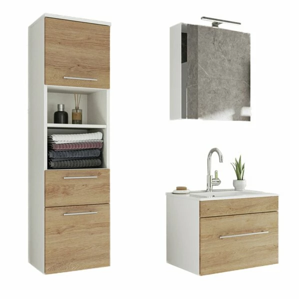 3-teiliges Badmöbel-Set VIVA – Eiche Hell – LED-Beleuchtung