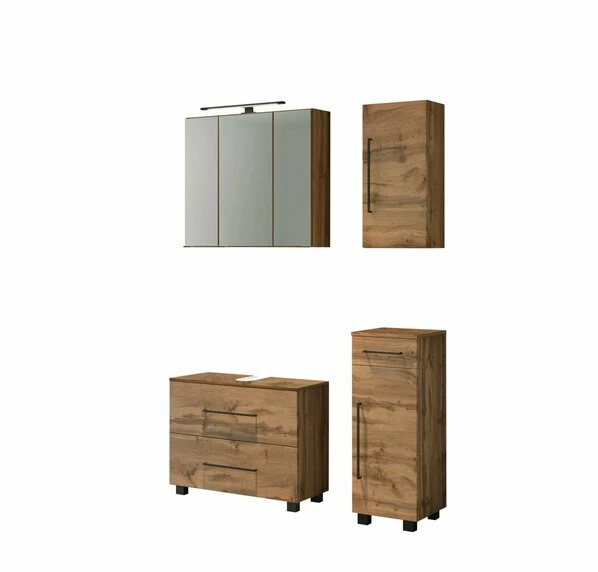 Dieses Badmöbel-Set aus der Serie LUZERN bietet Ihren Badprodukten einen großen Aufbewahrungsraum. Verkleidet mit einer hochwertigen Nachbildung der Wotaneiche, verleiht dieses Badmöbel-Set Ihrem Bad eine zum Wohlfühlen angenehme Atmosphäre. Die Griffe und Füße in Schwarz fügen den Schränken des Badmöbel-Sets einen modernen Akzent hinzu. Das Badmöbel-Set umfasst einen Spiegelschrank, Unterbeckenschrank, Hängeschrank und einen Unterschrank. Somit erhält Ihr Badezimmer eine komplette Einrichtung mithilfe dieses Badmöbel-Sets.