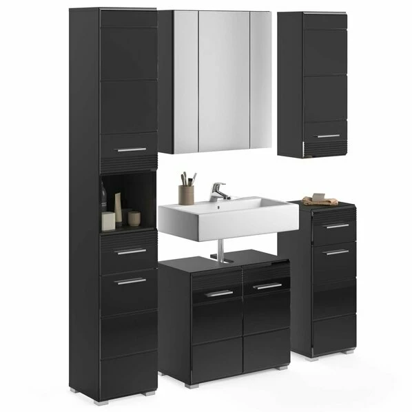 Das 5-teilige Badmöbel-Set bestehend aus einem Hochschrank, einem Waschbeckenunterschrank, einem Unterschrank, einem 3D-Spiegelschrank und einem Hängeschrank wertet Ihr Bad erheblich auf! Die eleganten schwarzen Hochglanzfronten zeichnen ein aufregendes Gesamtbild. Hinter verschiedenen Türen finden Sie genügend Stauraum für Ihre Badutensilien. Mit dem 3D-Spiegelschrank haben Sie Ihr Äußeres jederzeit aus jedem Winkel im Blick.