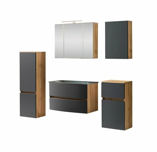 5-teiliges Badmöbelset KOPENHAGEN – Matt Grau – Wotan Eiche – Glasbecken Grau