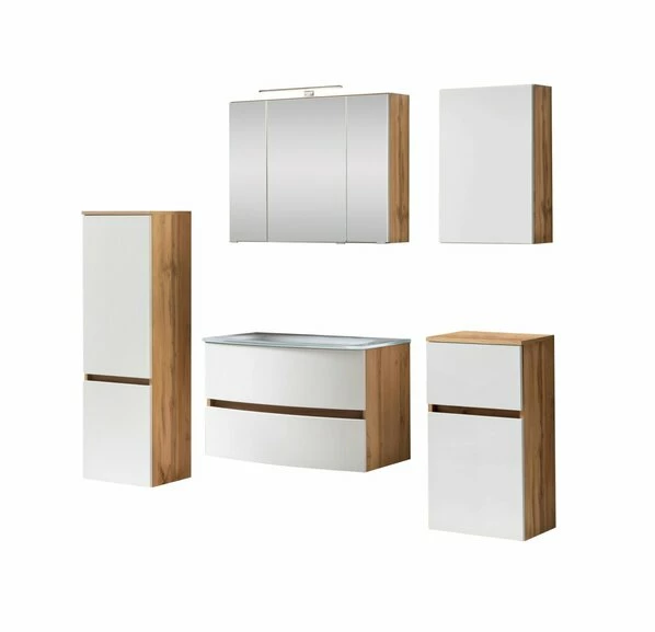 5-teiliges Badmöbelset KOPENHAGEN – Weiß Matt – Wotan Eiche – Glasbecken Weiß