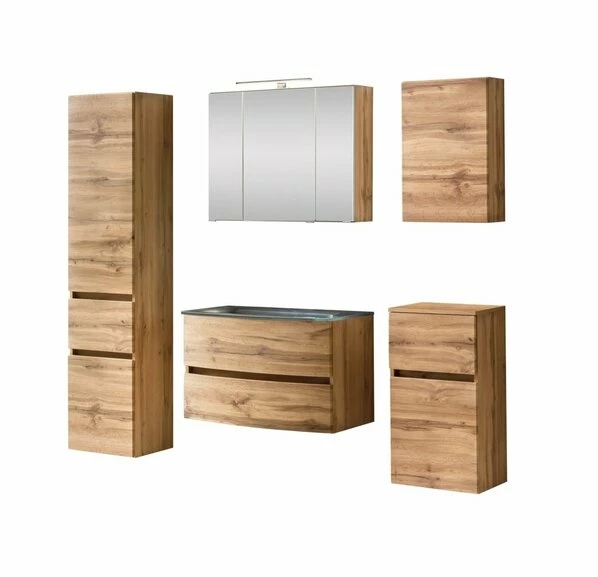 5-teiliges Badmöbelset KOPENHAGEN – Wotan Eiche – Glasbecken Grau