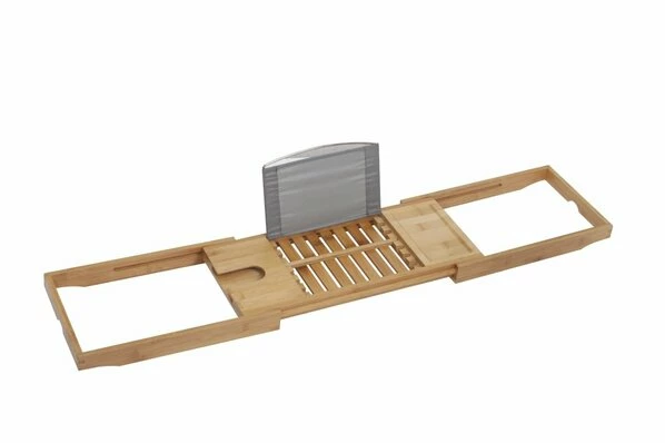 Entspannung erster Klasse – das Badewannentablett aus Bambus schenkt Ihnen die Möglichkeit während des Badens mit Ihrem Tablet einen Film zu schauen und dabei ein Glas Wein zu genießen. Lassen Sie den Alltagsstress von sich fallen und genießen ein angenehmes Bad! Das Tablett lässt sich von 75 cm auf bis zu 105 cm ausziehen und passt somit auf viele Badewannen. Belasten können Sie dieses mit etwa 5 kg.
