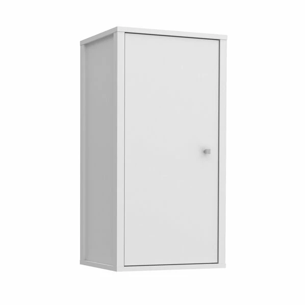 Schicker und moderner Hängeschrank in Weiß, der durch sein schlichtes Design punktet und somit in jedes Badezimmer passt. Hinter einer Tür können Sie reichlich Utensilien oder Badtextilien verstauen. Die Griffe aus Kunststoff setzen einen schicken optischen Akzent.