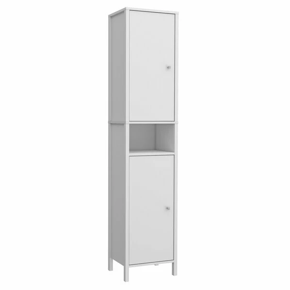 Moderner Hochschrank in Weiß, der durch sein schlichtes Design punktet und somit in jedes Badezimmer passt. Hinter zwei Türen und in einem offenen Fach können Sie Utensilien oder Badtextilien verstauen. Die Griffe aus Kunststoff setzen einen schicken optischen Akzent.