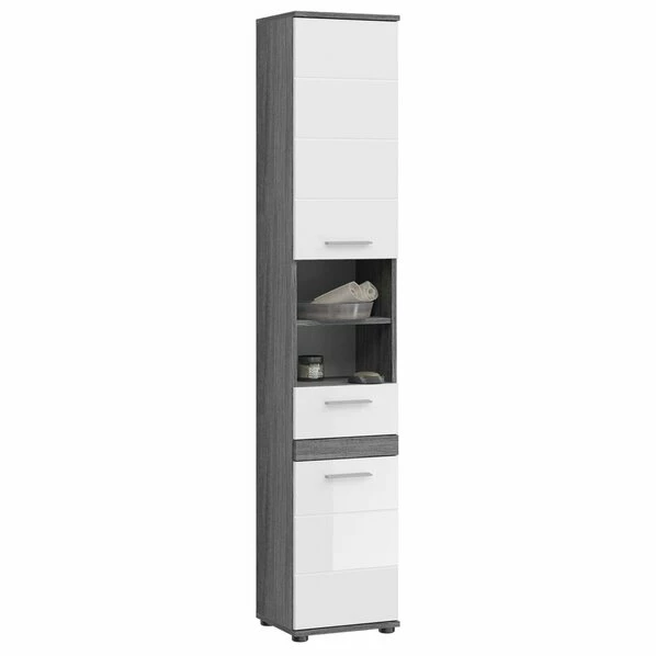 Der Hochschrank in Rauchsilber Nachbildung und hochglänzendem Weiß verfügt über zwei Türen und ist zudem mit zwei offenen Fächern und einem Schubkasten ausgestattet. Dieser Schrank eignet sich bestens für deine Badutensilien sowie zum Unterbringen von Handtüchern.