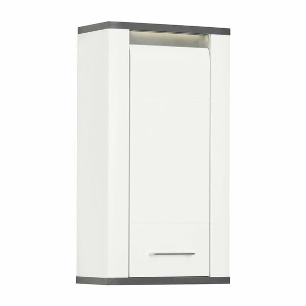 Der Hängeschrank ALASSIO überzeugt durch sein modernes Design. Die Fronten in Weiß Hochglanz werden durch die Absetzungen in Matera dunkel perfekt abgerundet. Hinter einer Tür findest du zwei Einlegeböden, auf denen all deine Badutensilien ihren Platz finden. Ein Highlight ist die integrierte LED-Beleuchtung.