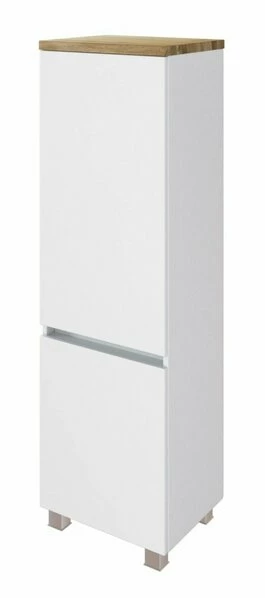 Der Midischrank LUCCA in Weiß ist ein moderner Badezimmerschrank mit einer Höhe von ungefähr 135 Zentimeter. Er ist mit zwei Drehtüren und einem Schubkasten ausgestattet und bietet somit viel Stauraum. Die Abdeckplatte in Wotan Eiche Nachbildung rundet das schöne Design zusätzlich ab.