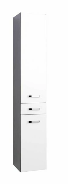 Schöner Seitenschrank BOLOGNA für Ihr Badezimmer. Der Korpus ist in Grafitgrau gehalten und die Fronten in Weiß Hochglanz. Er ist mit zwei Drehtüren und einem Schubkasten ausgestattet, die sich durch die Softclose-Funktion und dem Türdämpfer sanft schließen lassen.