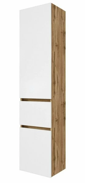Dieser Seitenschrank aus dem Badprogramm LUCCA/KOPENHAGEN überzeugt durch seinen Stauraum. Hinter den 2 Drehtüren finden Sie insgesamt 4 Einlegeböden, auf denen Sie Kosmetik und andere Badutensilien unterbringen können. Zusätzlich besitzt er ein Schubkasten mit Softclose-Funktion. Aber nicht nur der Stauraum überzeugt, sondern auch das Design. Der Korpus in Wotan Eiche Nachbildung ist mit Fronten in Weiß versehen. Der Seitenschrank ist ein echter Hingucker.