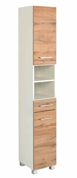 Der Seitenschrank stellt mit einer Höhe von etwa 185 Zentimeter reichlich Stauraum zur Verfügung. Hinter zwei Drehtüren, im Schubkasten und in den beiden offenen Nischen können Sie viele Ihrer Badtextilien, Kosmetik oder auch Dekorationen unterbringen.