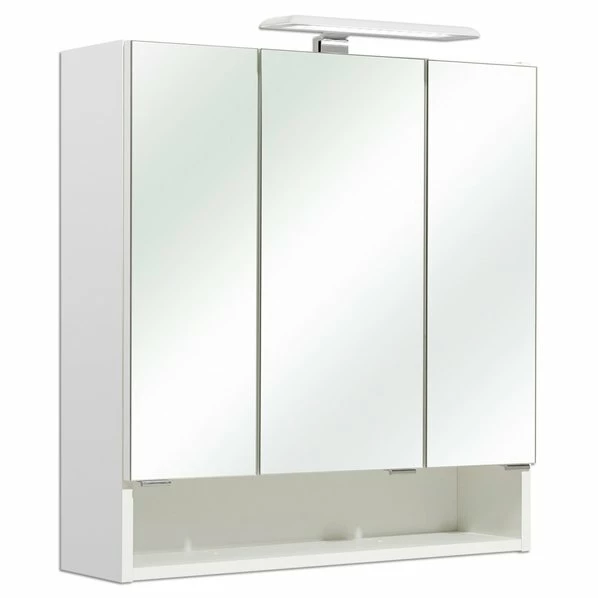 Praktisch und nützlich ist dieser Spiegelschrak mit seinen drei Türen. Dahinter finden Sie drei Einlegeböden, die in der Höhe variabel sind. Unten befindet sich ein durchgehendes offenes Fach, in welchem Sie Platz finden für alles, was Sie schnell zur Hand haben möchten. Die breite LED Leuchte spendet reichlich Licht und die Steckdose im Inneren ist praktisch für den Gebrauch mit Zahnbürsten oder Ihrem Fön.