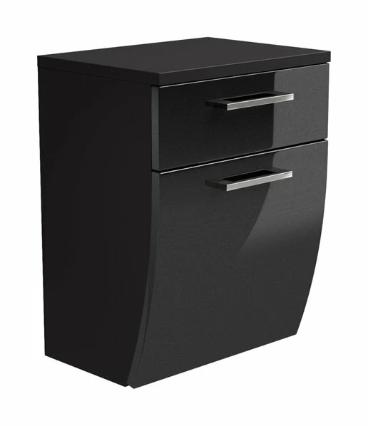 Der anthrazitfarbene Unterschrank präsentiert sich aus dem modernen Badprogramm RIMA, das mit seinem geschwungenen Unterbau besticht. Das Möbelstück wird hängend an die Wand montiert und bietet mit einer geräumigen Klappe, sowie einem Schubkasten reichlich Stauraum für Ihre Badutensilien. Die Echtmetallgriffe verleihen dem Unterschrank RIMA noch das gewisse Etwas.