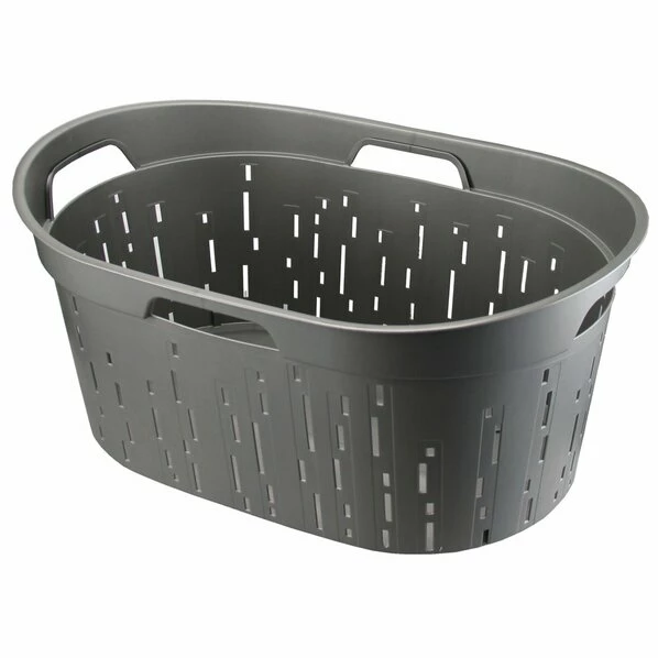 Dieser praktische und schlichte Wäschekorb in Metallgrau ist dein Helfer für Schmutzwäsche. Das stabile Kunststoff-Material sorgt dafür, dass etwa 42 Liter Wäsche in dem Korb ihren Platz findet. Mit den vier Griffen kann der Korb über zwei Wege transportiert werden. Die Lüftungsschlitze schützen die Wäsche vor dem Stocken.