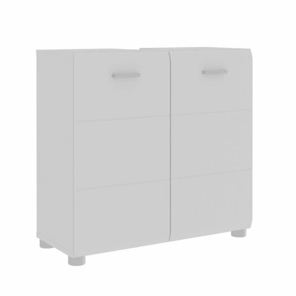 Moderner Waschbeckenunterschrank in Weiß, der durch sein schlichtes Design punktet und somit in jedes Badezimmer passt. Hinter den zwei Drehtüren können Sie reichlich Utensilien oder Badtextilien verstauen. Die Griffe aus Kunststoff in Aluoptik setzen einen hübschen optischen Akzent.